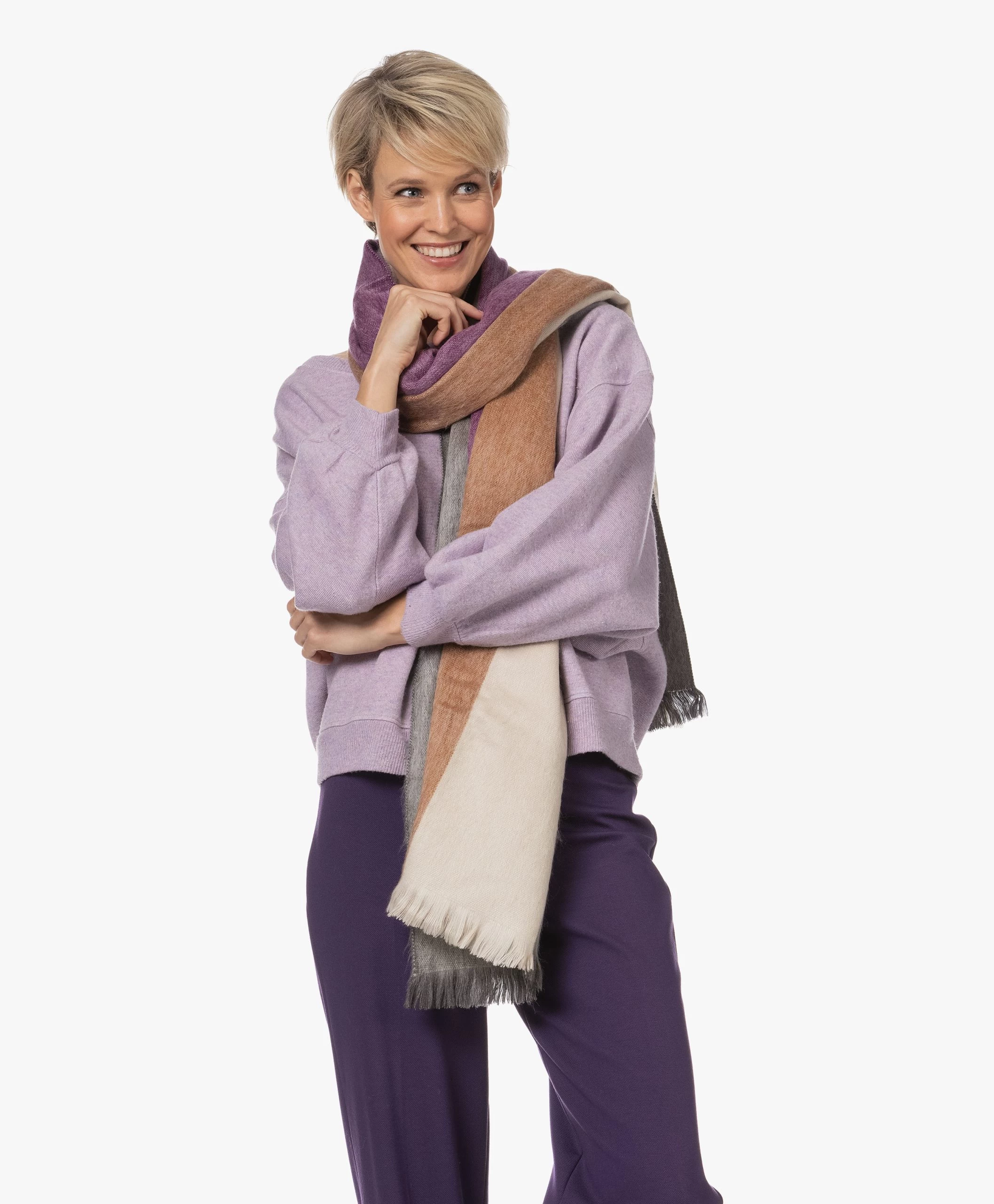 Zachter dan zijde en warmer dan schapenwol – deze dubbelzijdig geweven, gestreepte sjaal in paars, camel, off-white en grijs van Alpaca Loca is handgemaakt van alpacawol met een natuurlijke glans. De pure, gladde vezel bevat geen lanoline en is daardoor hypoallergeen en van nature water- en vuilafstotend. Voeg stijl en comfort toe aan iedere look!