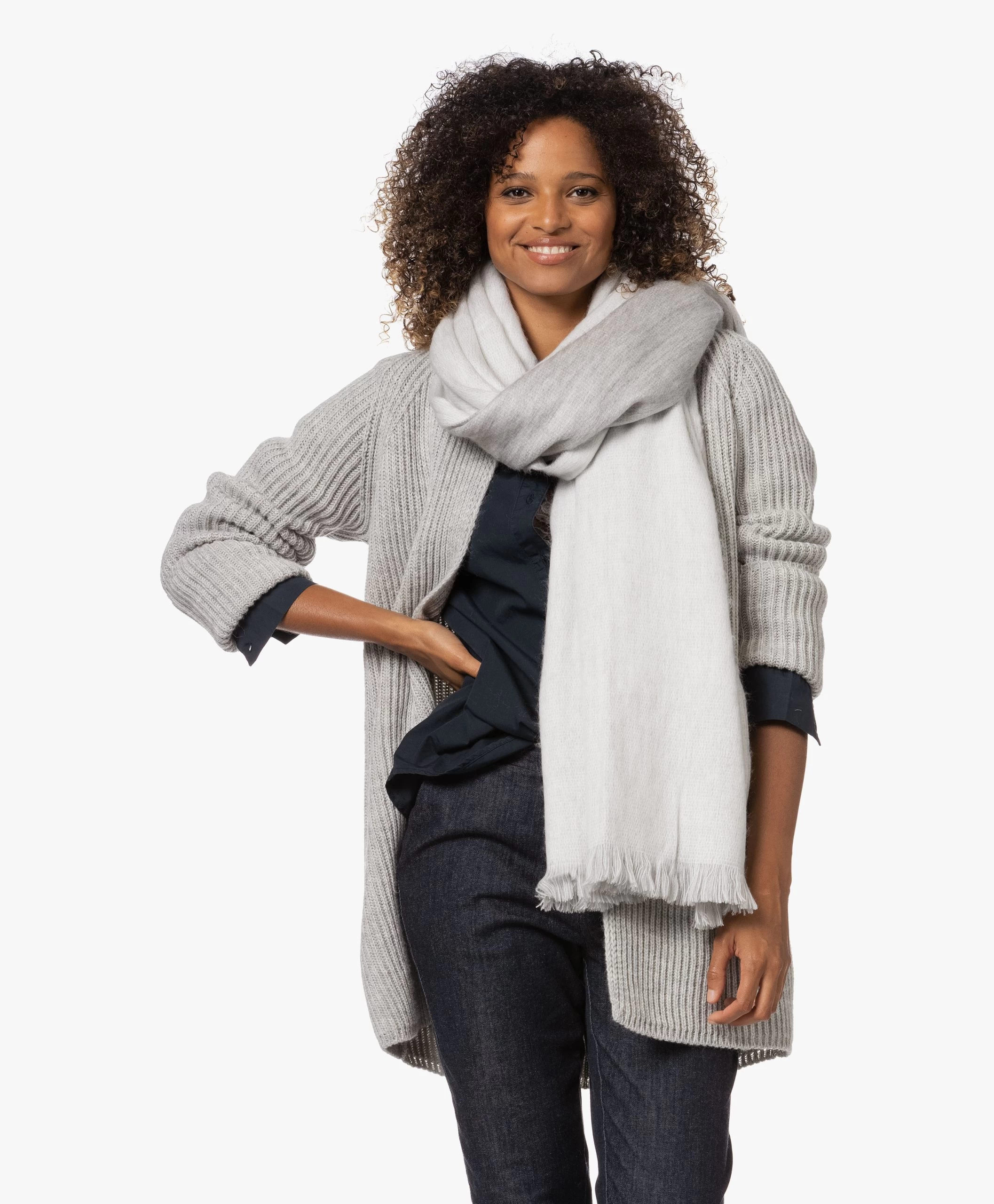 Zachter dan zijde en warmer dan schapenwol – deze dubbelzijdig geweven sjaal in lichtgrijs en off-white van Alpaca Loca is handgemaakt van alpacawol met een natuurlijke glans. De pure, gladde vezel bevat geen lanoline en is daardoor hypoallergeen en van nature water- en vuilafstotend. Voeg stijl en comfort toe aan iedere look!