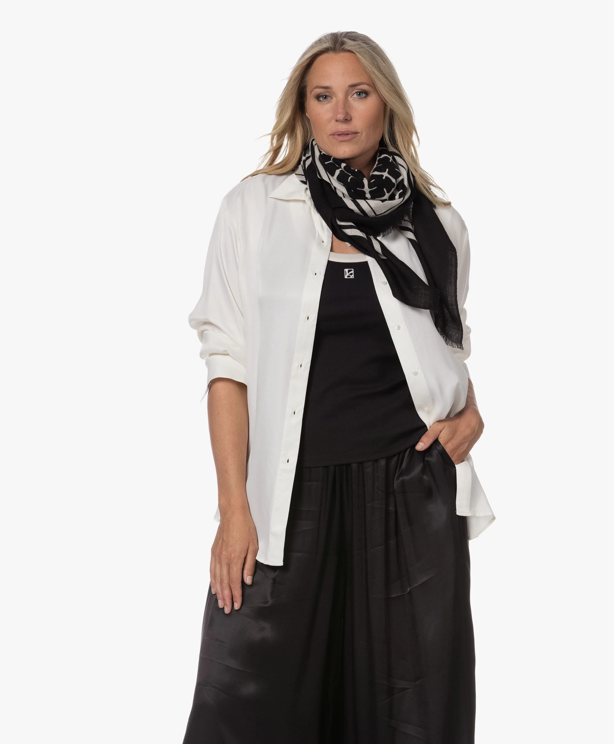 By Malene Birger ontwerpt sjaal Cornelis met verfijnde franjes langs de zijdes en de signature Arabische bloemenprint in off-white op een zwarte basis. Het vierkante design heeft dankzij de kwaliteit van puur wol een uiterst zachte greep en is daardoor een onmisbaar accessoire voor elke dag.