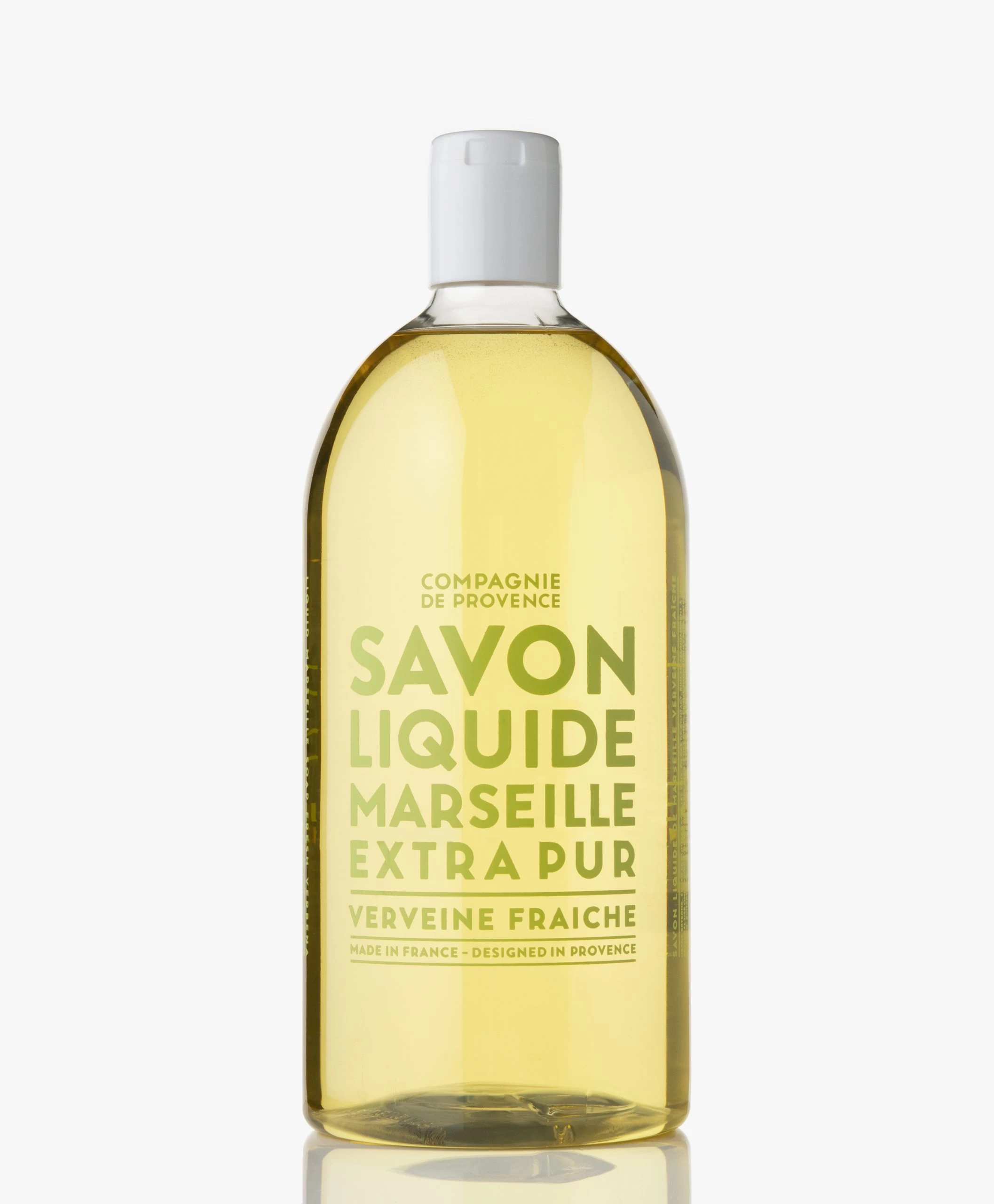 Deze vloeibare ‘Fresh Verbena’ Marseille-zeep van Compagnie de Provence hydrateert en reinigt de huid op milde wijze – én komt nu in een handige navulverpakking – met de frisse geur van citroenverbena, met aangename geurnoten van citroen. Verrijkt met plantaardige oliën en natuurlijke ingrediënten als biologische olijfolie en kokosolie. Volgens traditionele wijze in een koperen ketel bereid met plantaardige oliën.