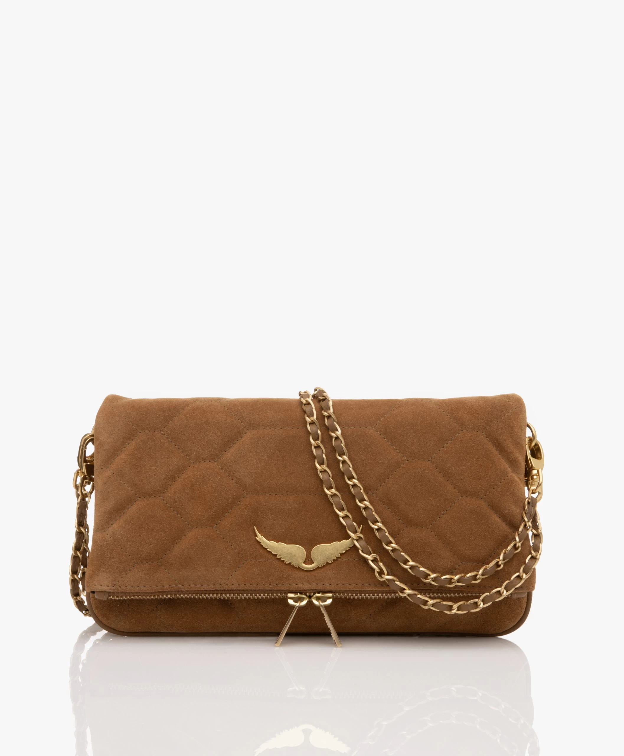 Deze ultra-veelzijdige schoudertas van Zadig & Voltaire kan ook gedragen worden als fold-over clutch. De tas is gemaakt van zacht en soepel suède in een cognacbruine kleur. Het ontwerp is volledig gewatteerd en heeft een doorgestikte afwerking die een patroon van zeshoeken laat zien. De voorzijde is voorzien van goudkleurig rock-chic vleugelembleem met een matte afwerking.